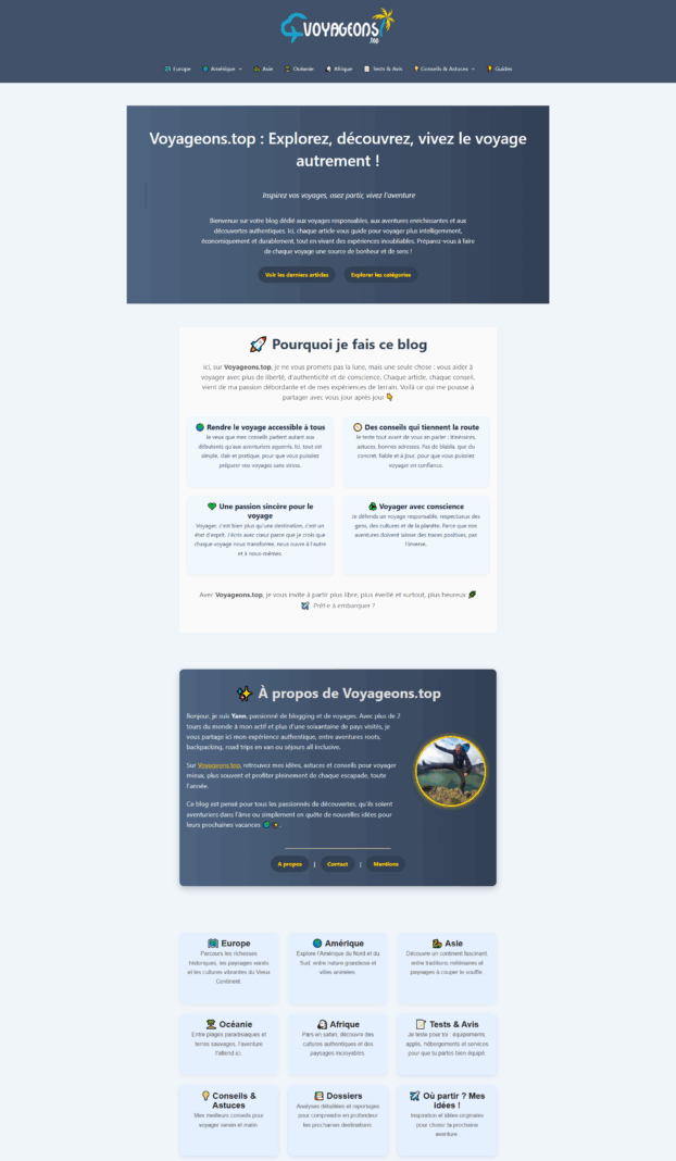 Objectif : Démontrer mon expertise en développement web à travers un projet passion : créer un blog de voyage aussi performant qu’agréable à lire, capable de gérer un contenu riche et des médias lourds sans sacrifier la vitesse.